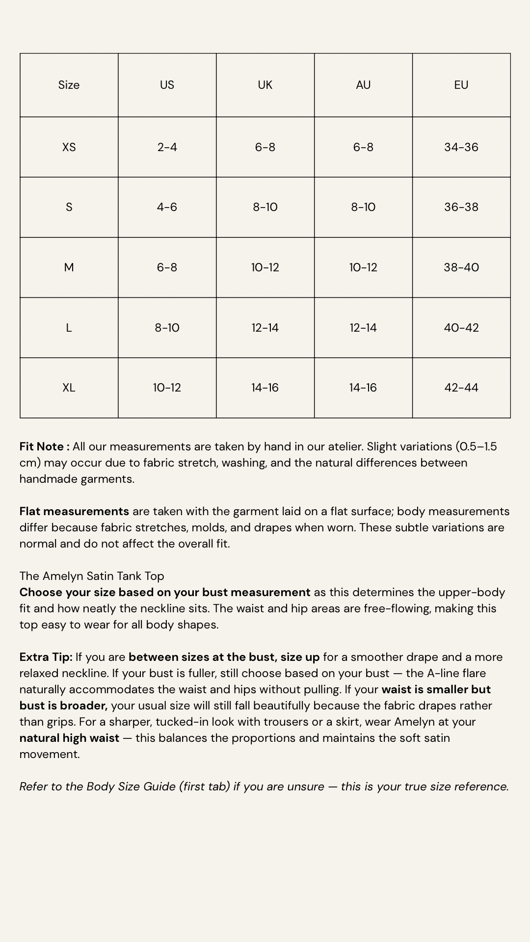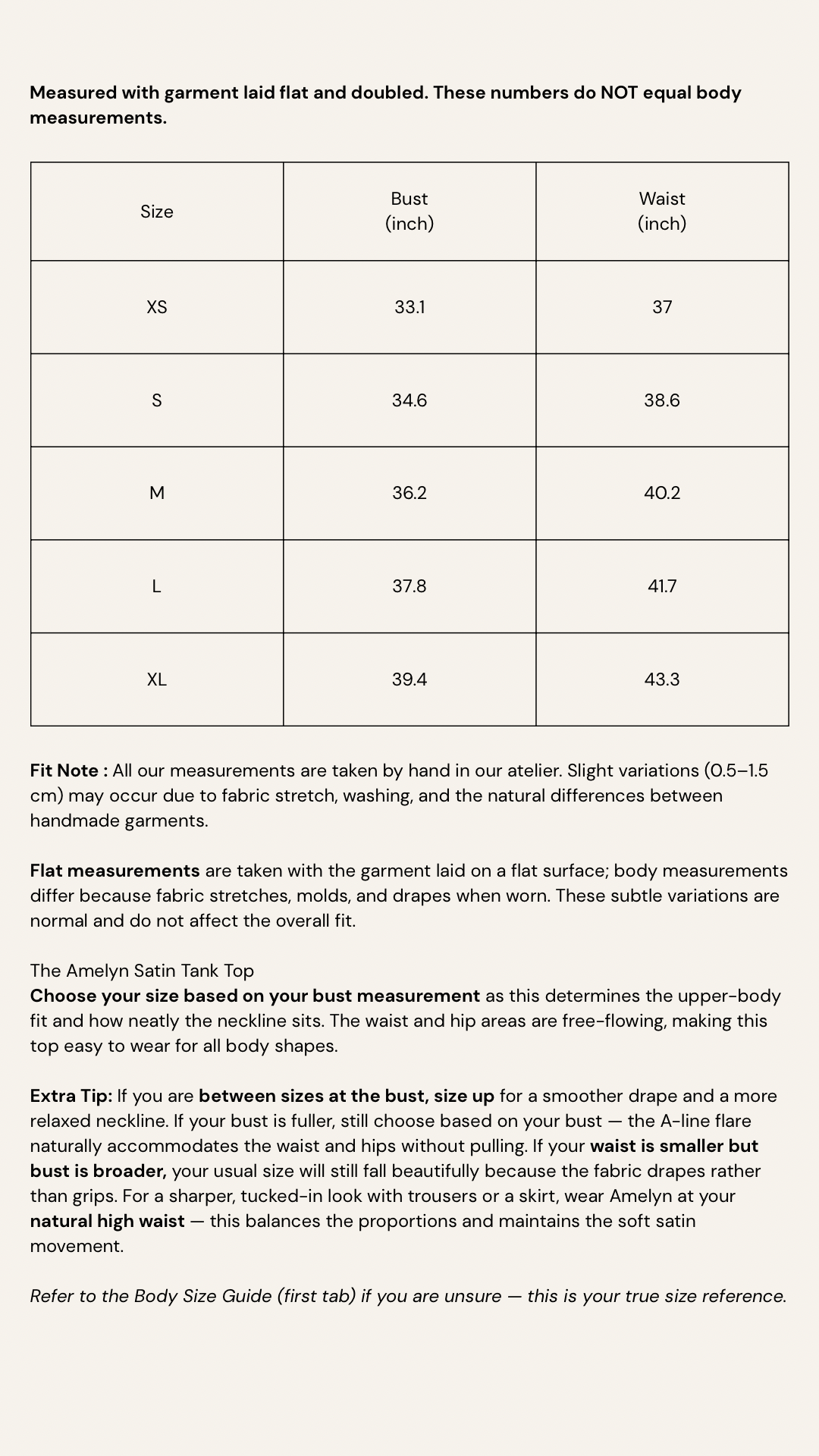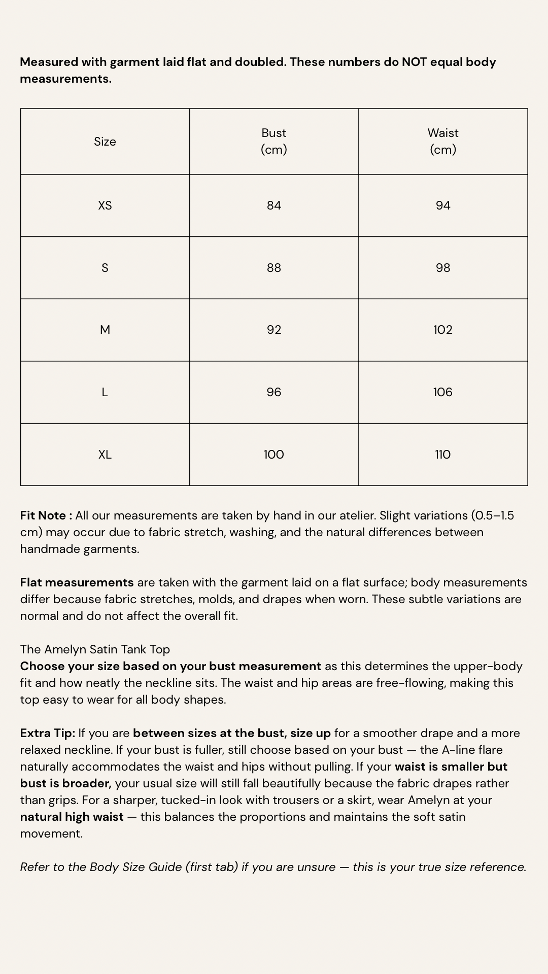 The Amelyn Satin Tank Top is crafted from a soft, fluid woven satin with a natural drape and gentle sheen. The silhouette is relaxed through the bust and waist, designed to fall cleanly without clinging. A softly curved scoop neckline and wider, bra-friendly straps offer comfortable, easy coverage. The bust has light structure while the waist and hem flare gracefully, giving the top elegant movement and an effortless feel.