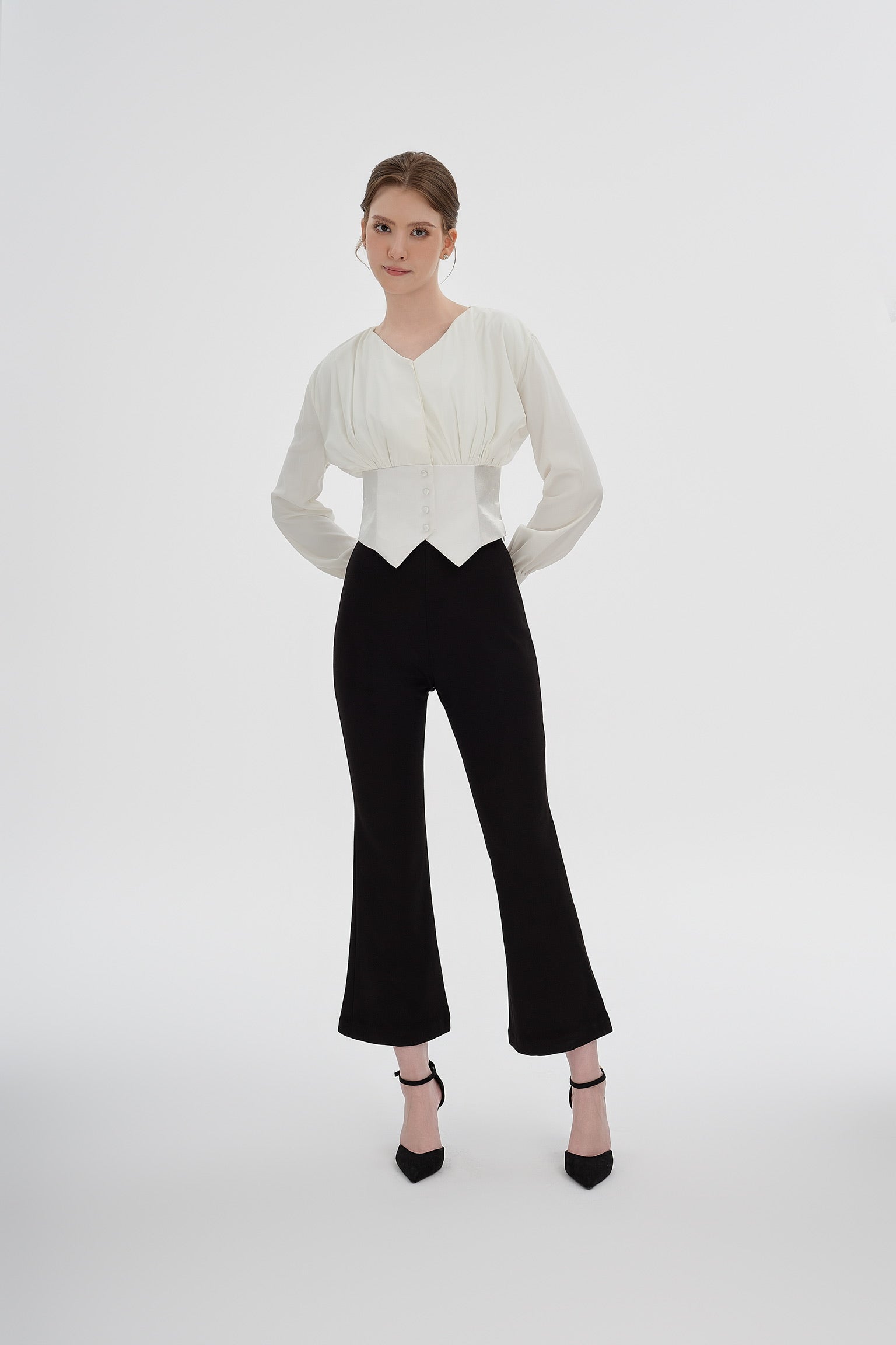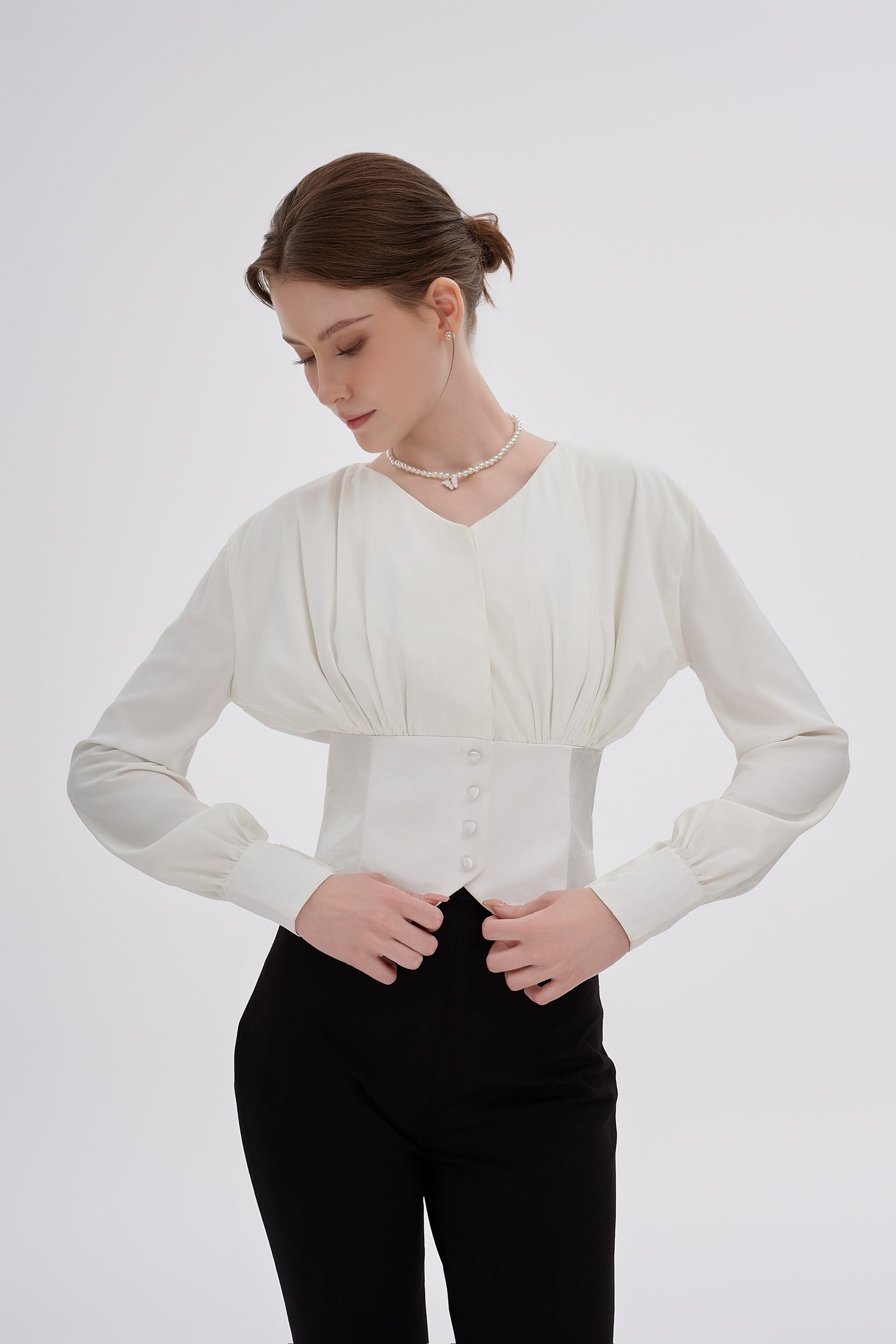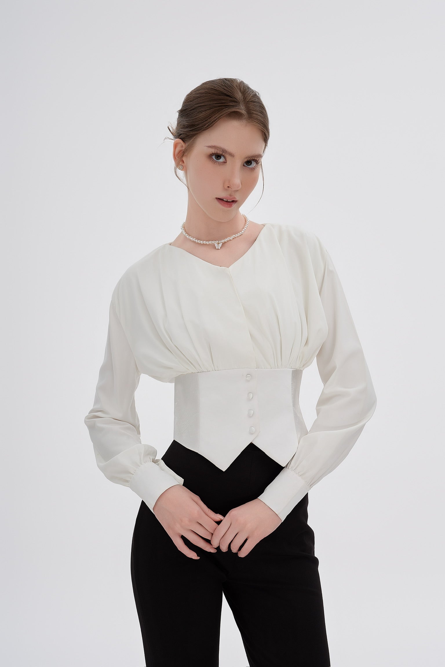 Belle blouse gives you a sophisticated and intriguing contrast. The upper portion crafted from soft, matte and cooling silk, offering a delicate touch and elegant drape, while the lower portion features a glossy waist that adds a modern twist and eye-catching sheen. This design creates a harmonious balance between classic elegance and contemporary flair.