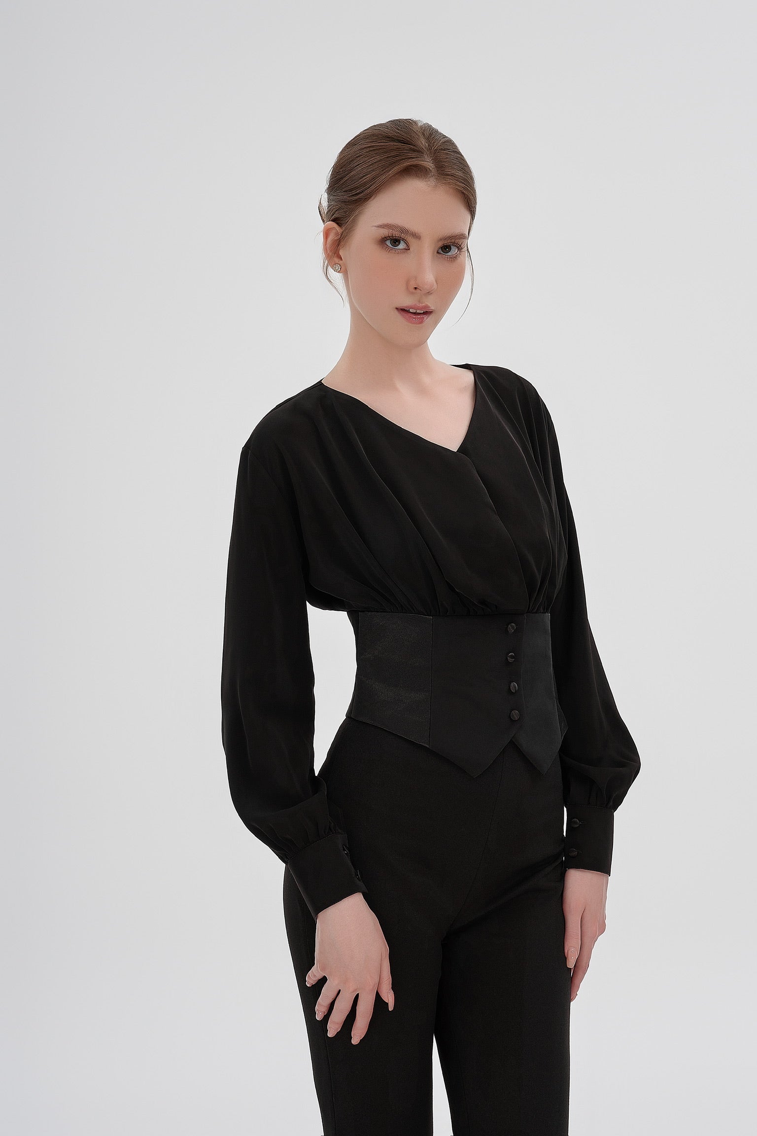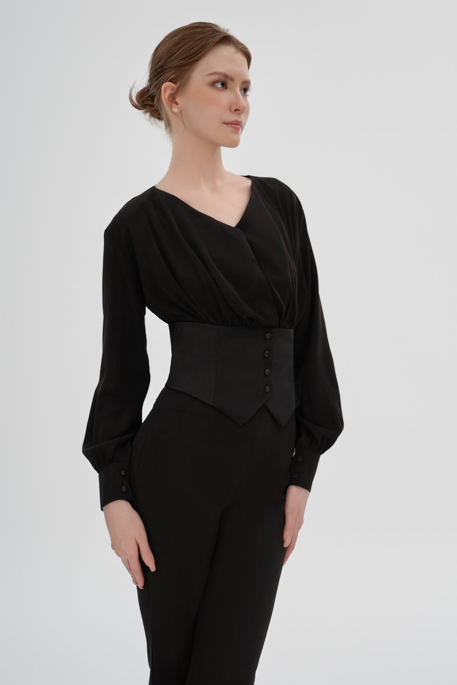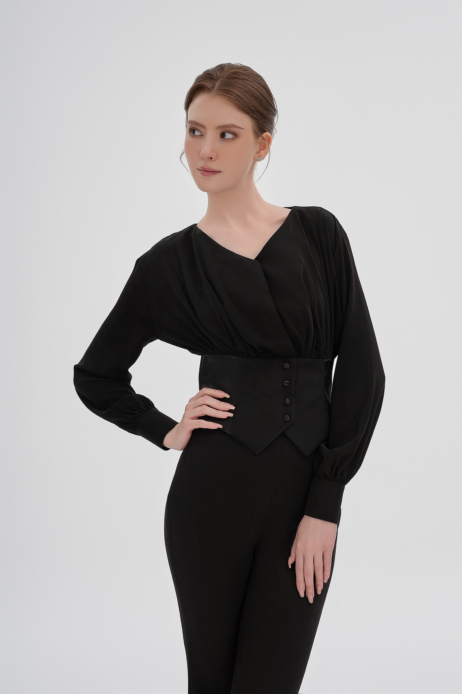 Styling-wise, this blouse could be paired with tailored trousers or a pencil skirt for a polished office look. For a more evening-appropriate ensemble, it could be paired with sleek pants.