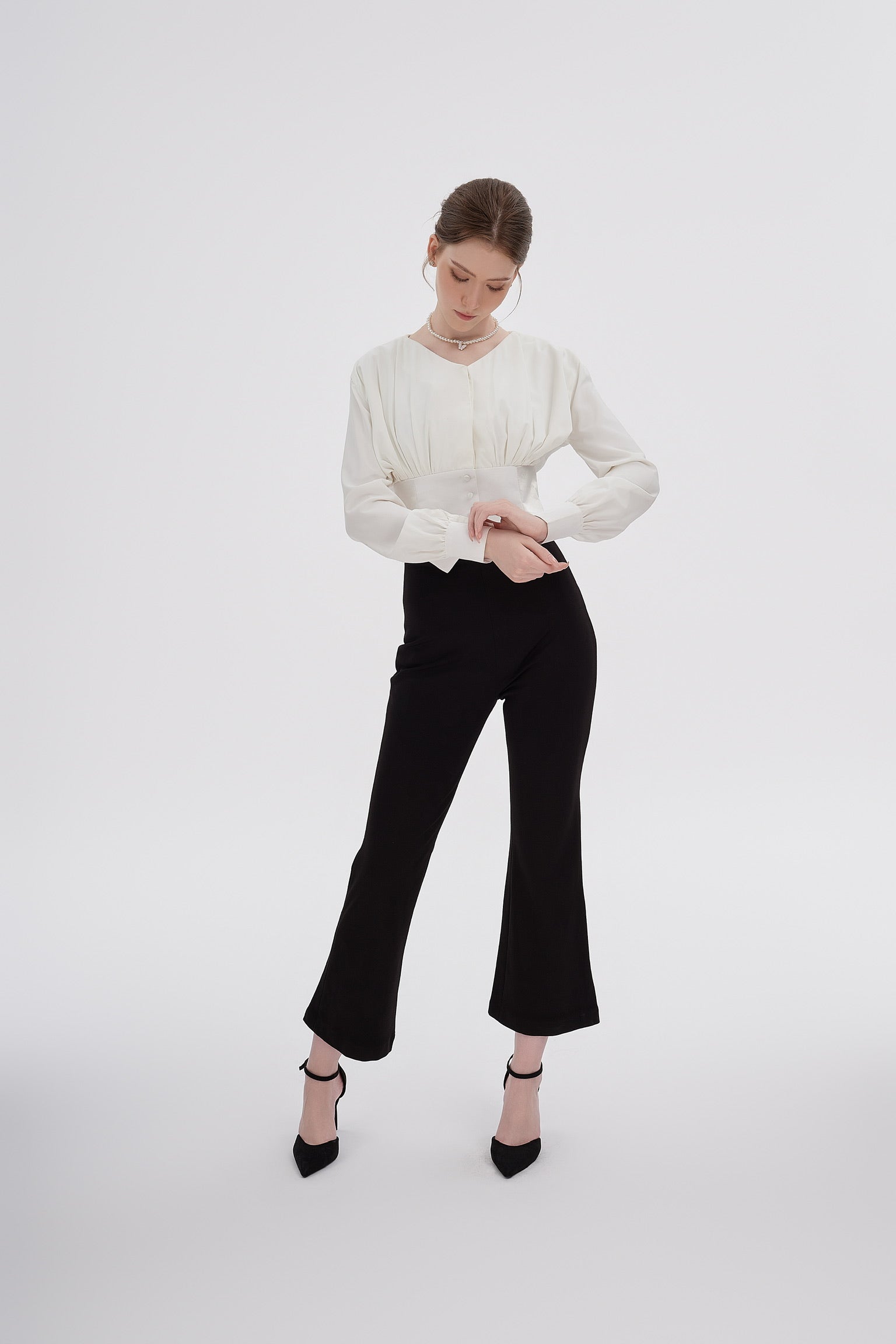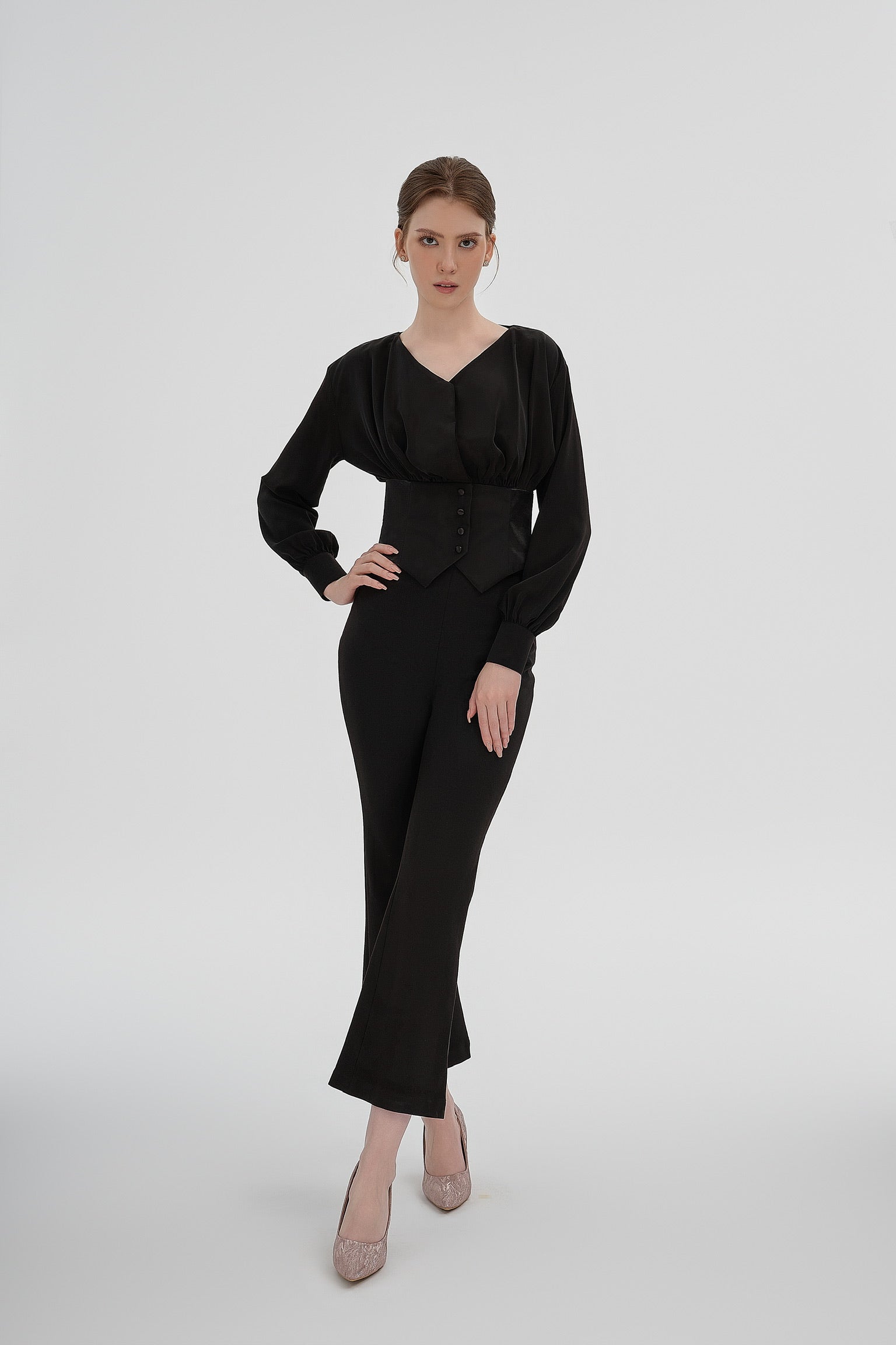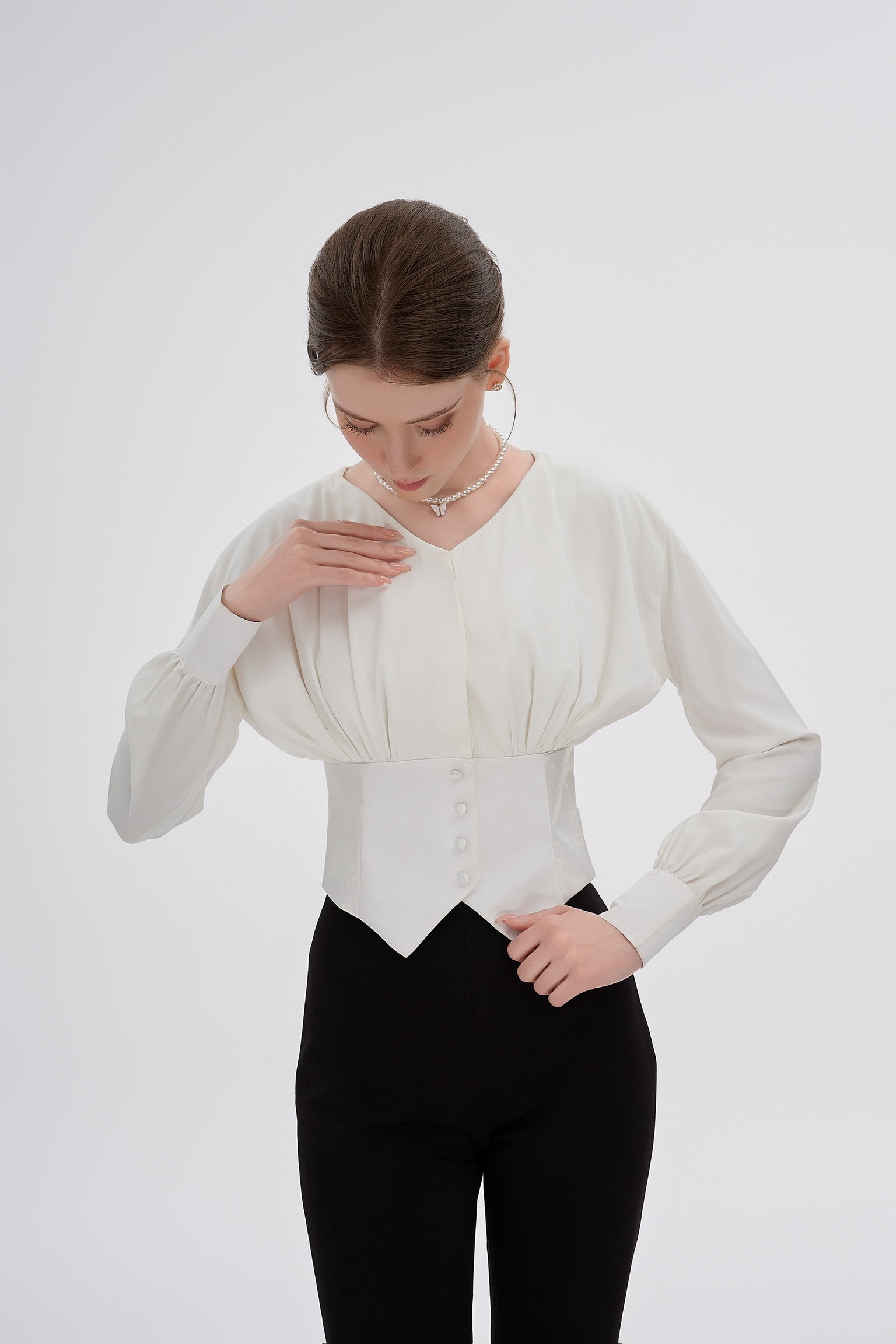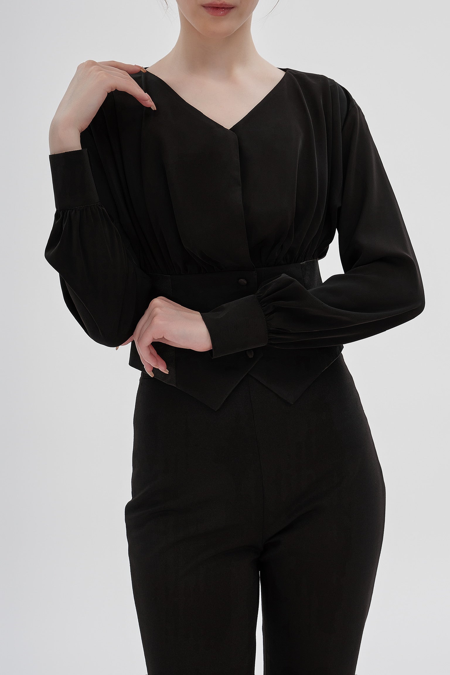 Styling-wise, this blouse could be paired with tailored trousers or a pencil skirt for a polished office look. For a more evening-appropriate ensemble, it could be paired with sleek pants.