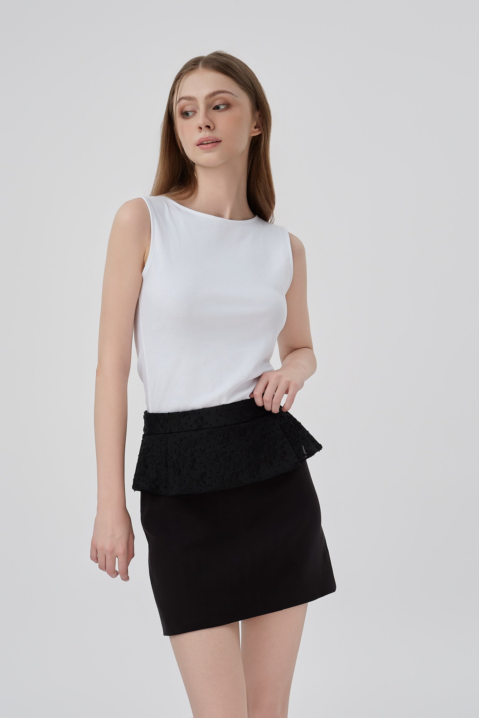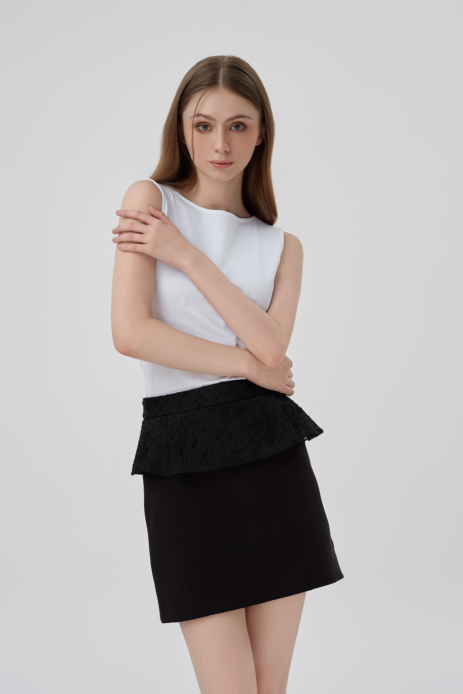 The standout feature is its sculpted peplum waist — made from textured chiffon with subtle embroidery — designed to flatter the midsection and add graceful dimension. The peplum flares gently over the hips, cinching the waist while adding just the right amount of feminine flair.