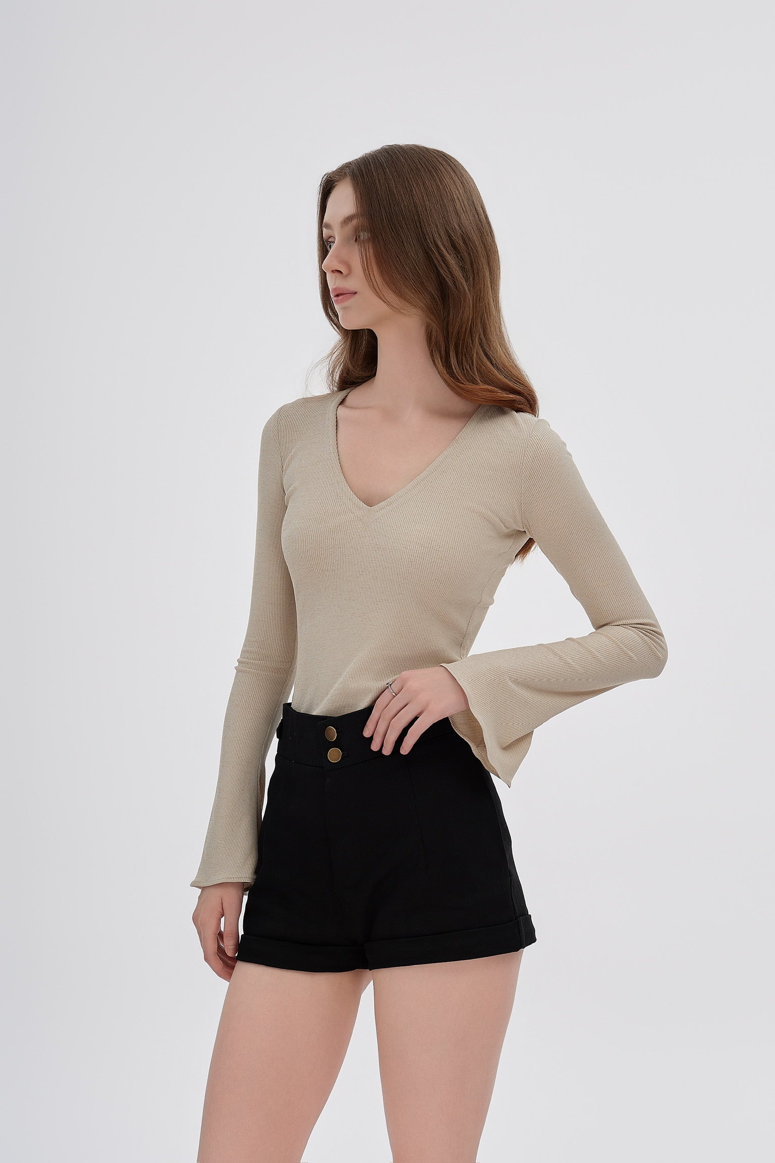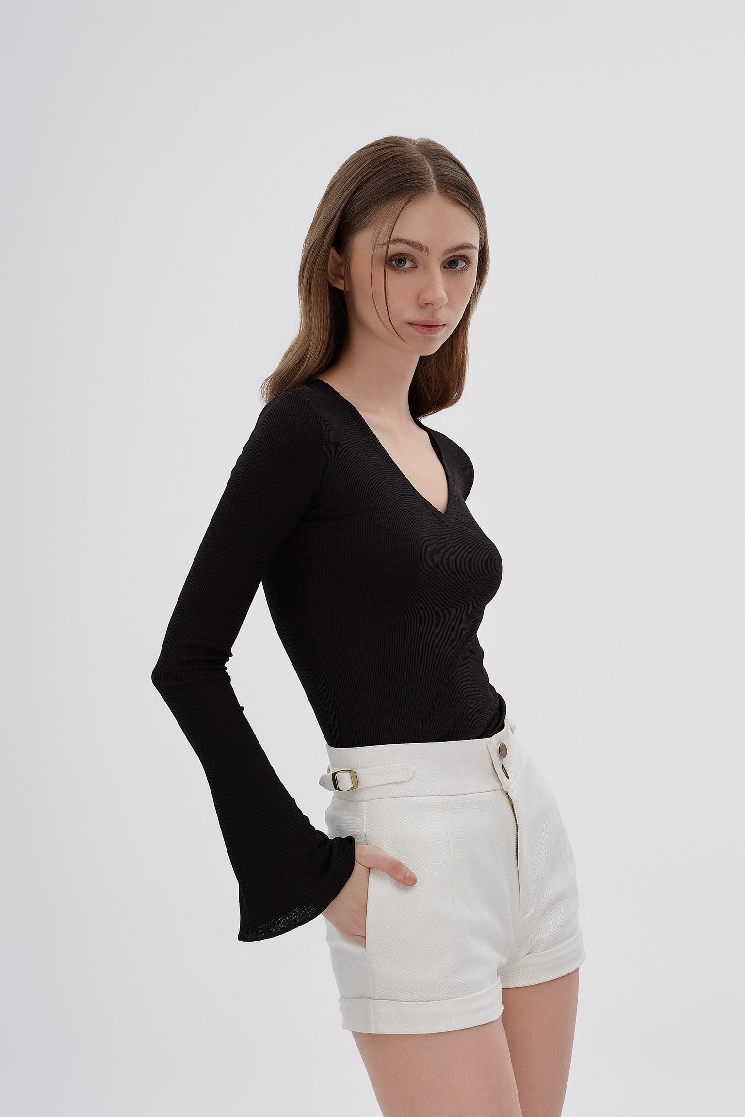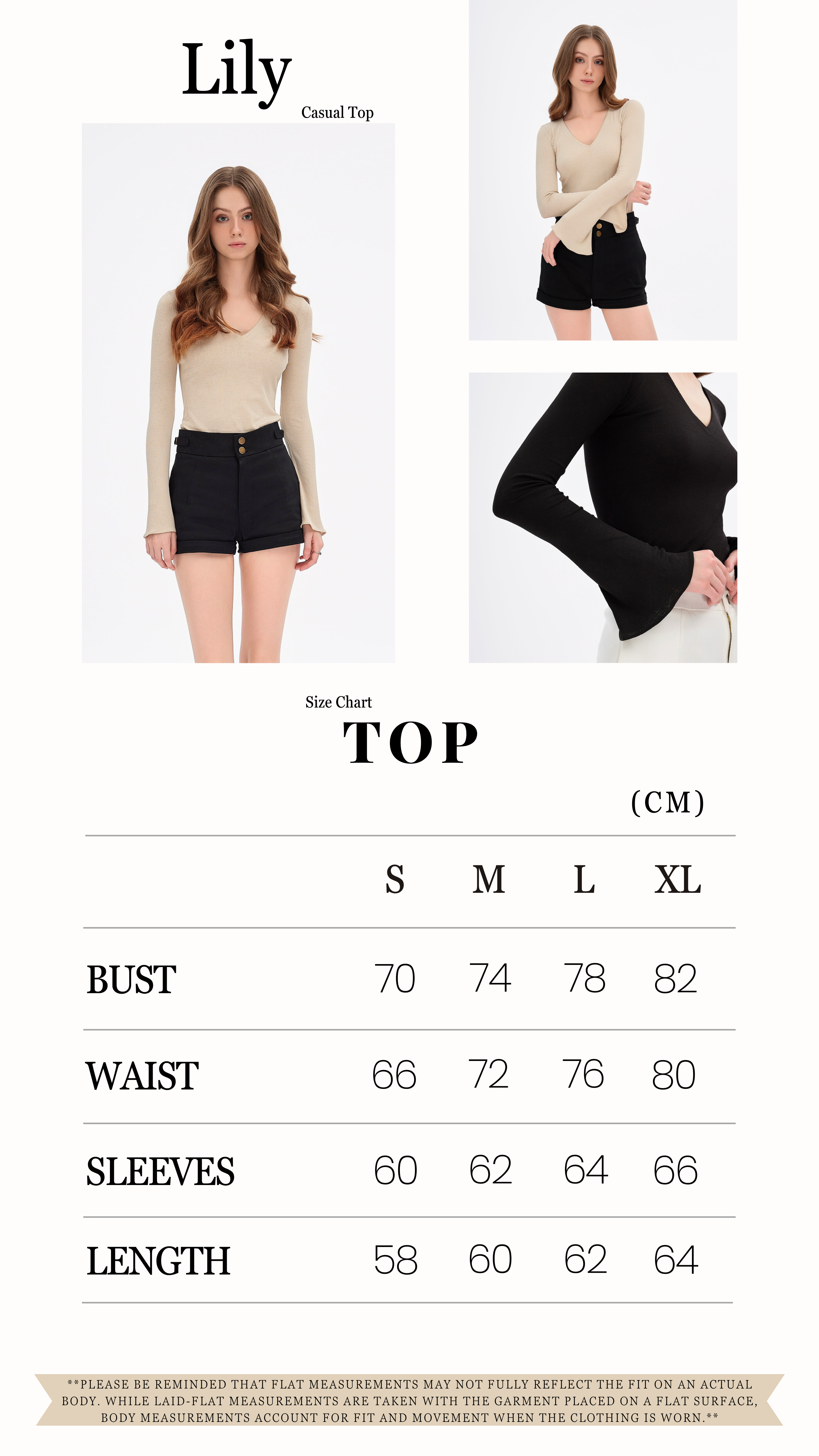 The Lily Casual Top is simplicity, sculpted. Made from a supple knit of 95% cotton and 5% spandex, it clings with comfort and breathes with ease—never stiff, never slouchy. The deep V neckline frames the décolletage, while subtly flared sleeves add a whisper of movement and quiet intent.