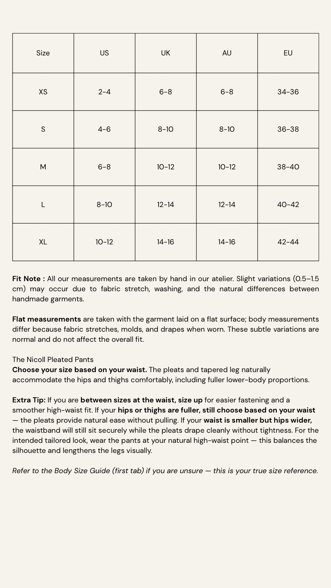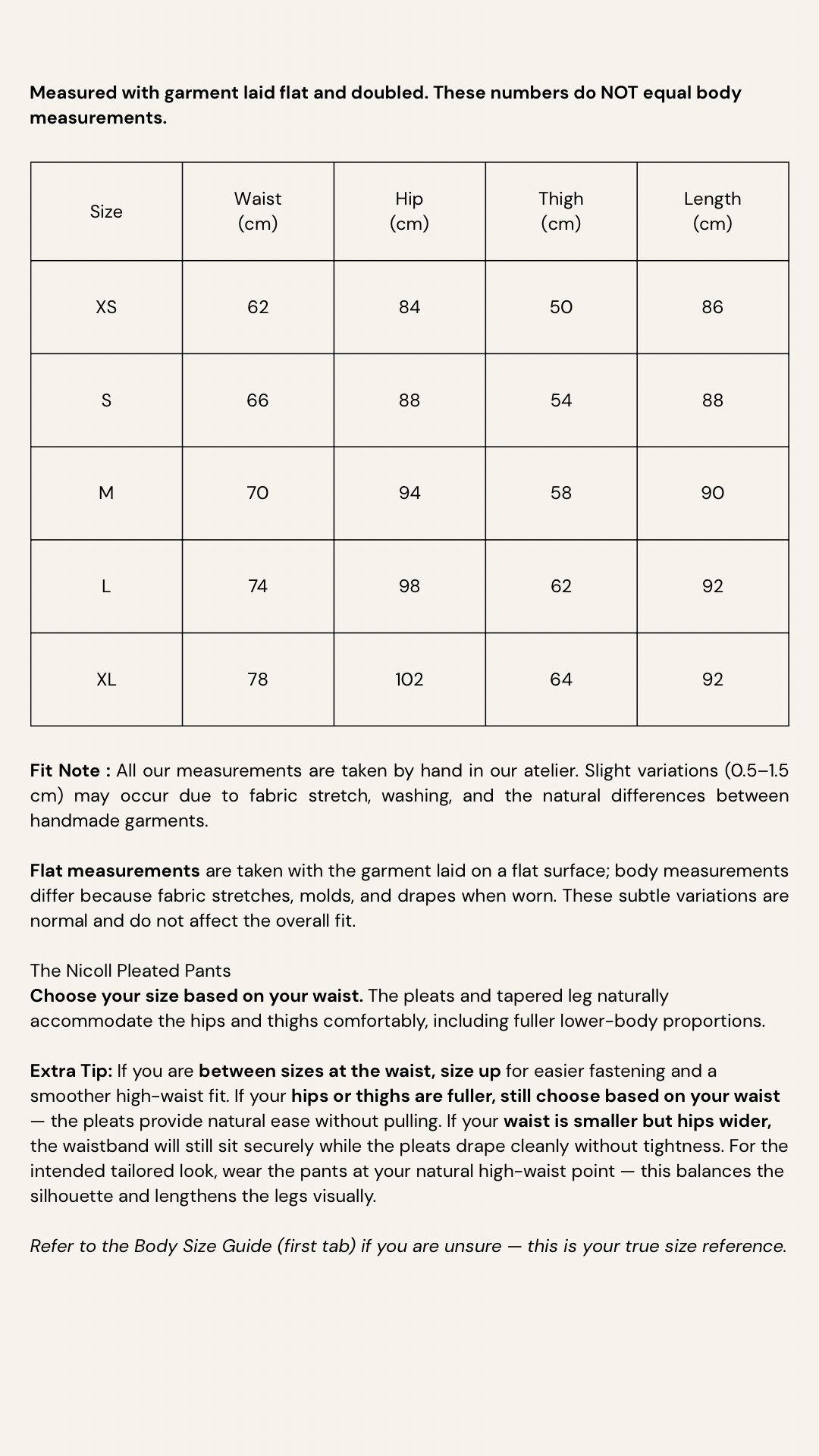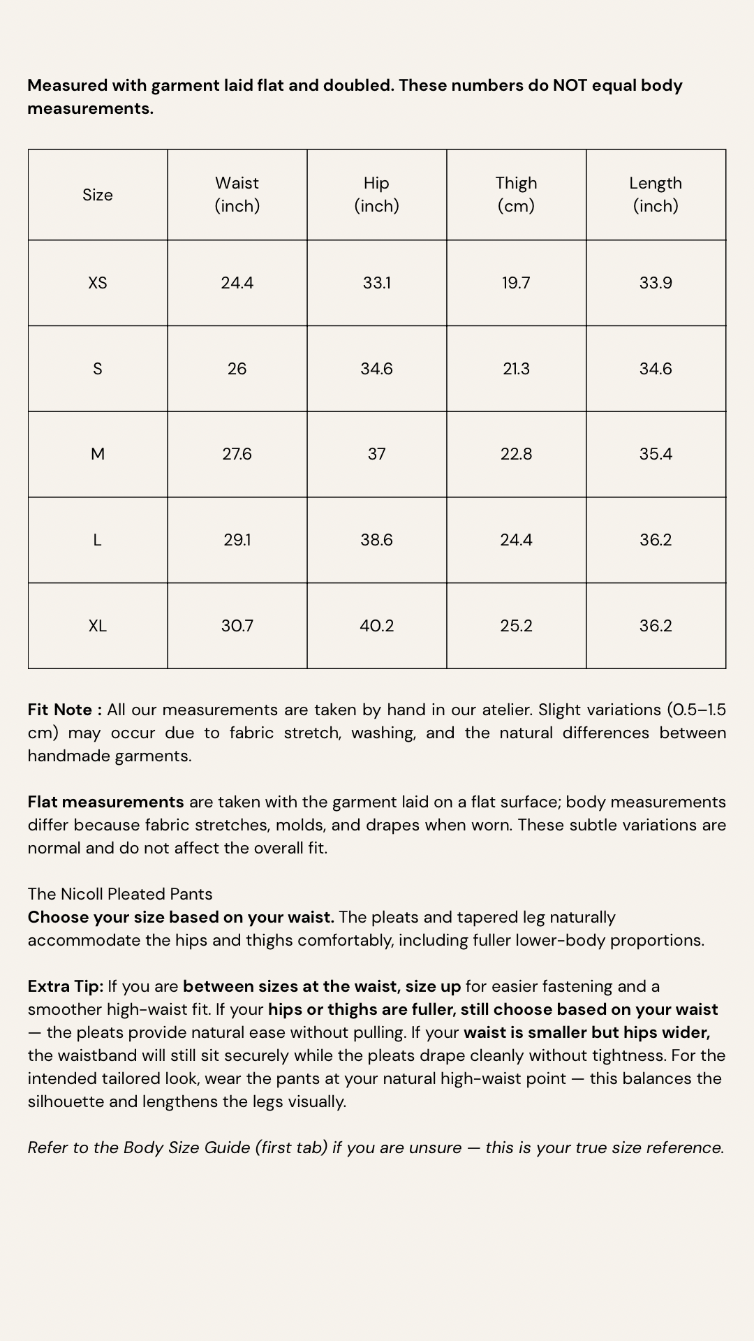 The Nicoll Pleated Pants are crafted from a breathable cotton-blend fabric with soft structure and an easy drape. Front pleats add gentle volume without bulk, while the tapered legs create a polished silhouette from morning errands to office hours. A discreet back zipper keeps the waistband clean and streamlined. Finished with a subtle side ribbon and cuffed hems for understated charm.