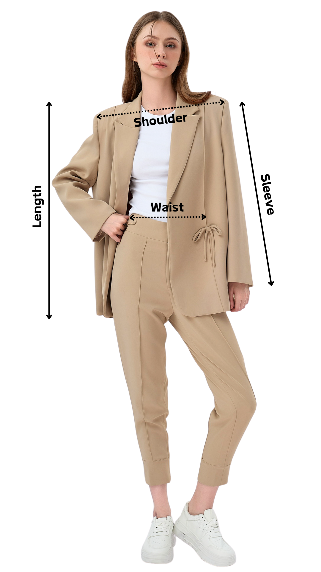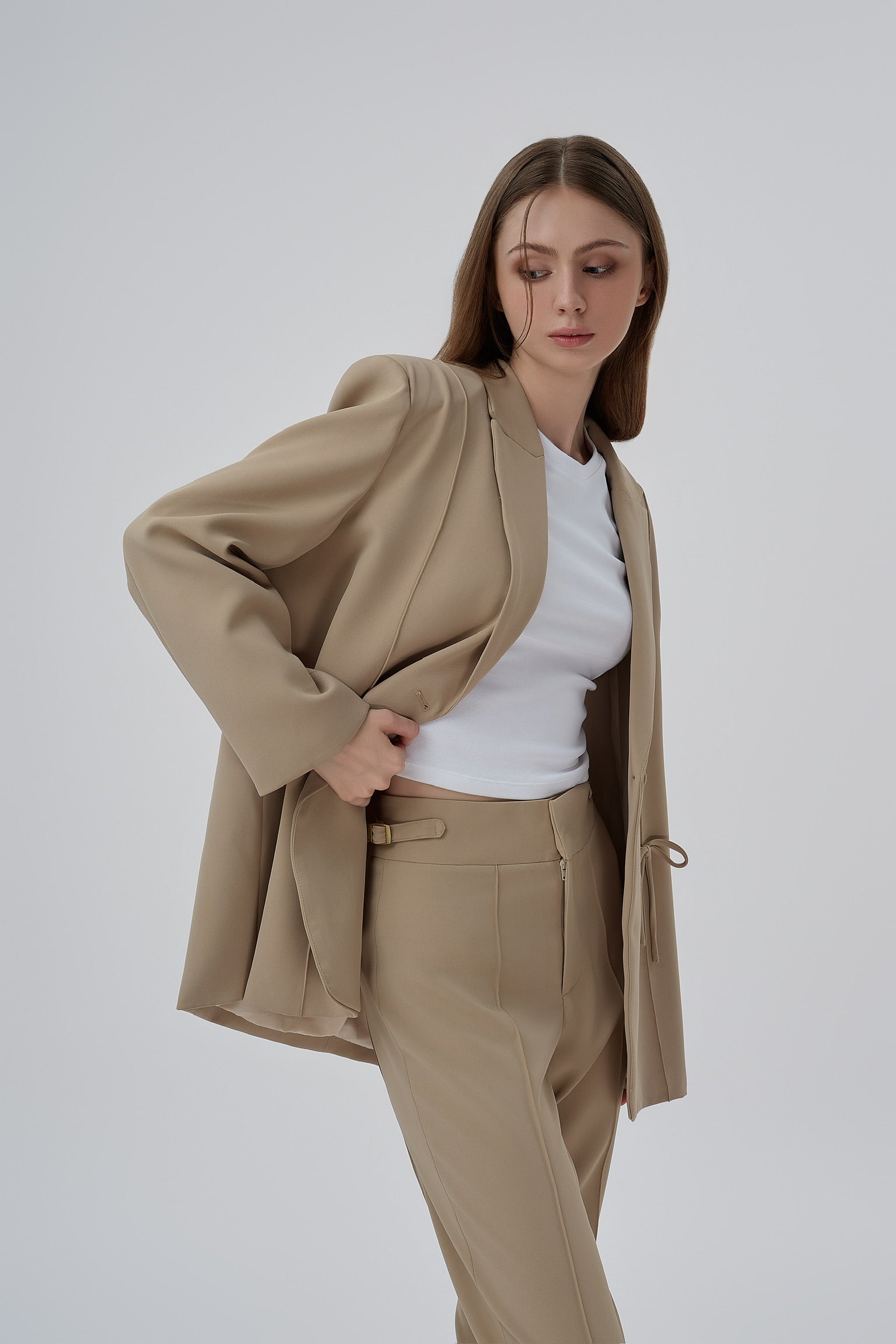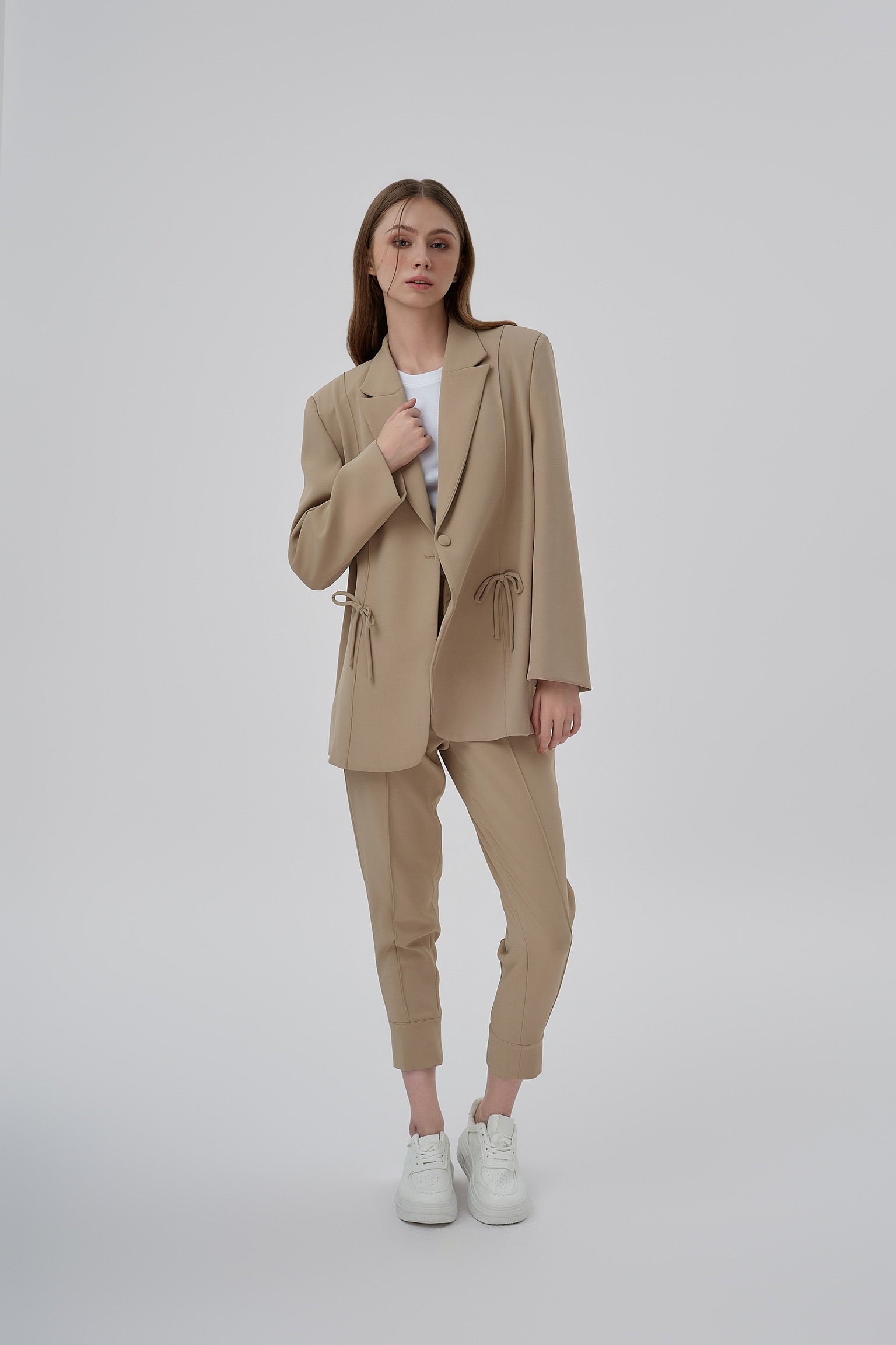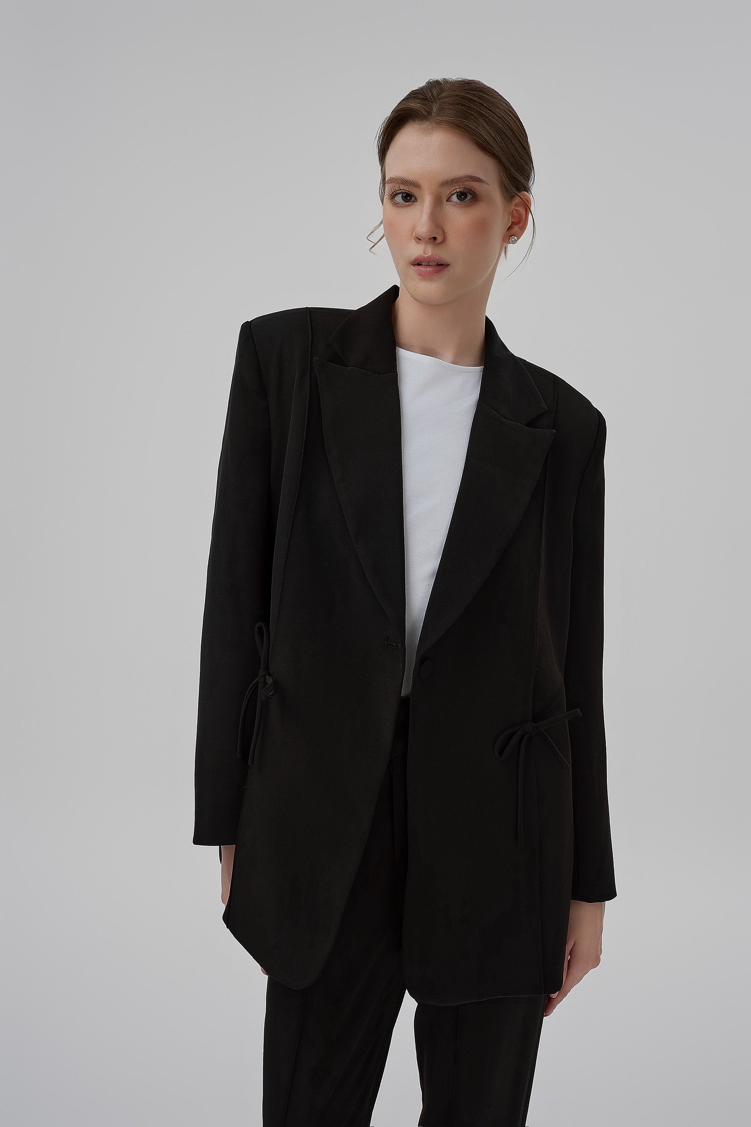 The Sheryl Blazer redefines structure with quiet luxury. Crafted in a softly oversized cut, it features clean shoulders, elongated lines, and delicate ribbon accents at the waist — a refined nod to femininity.