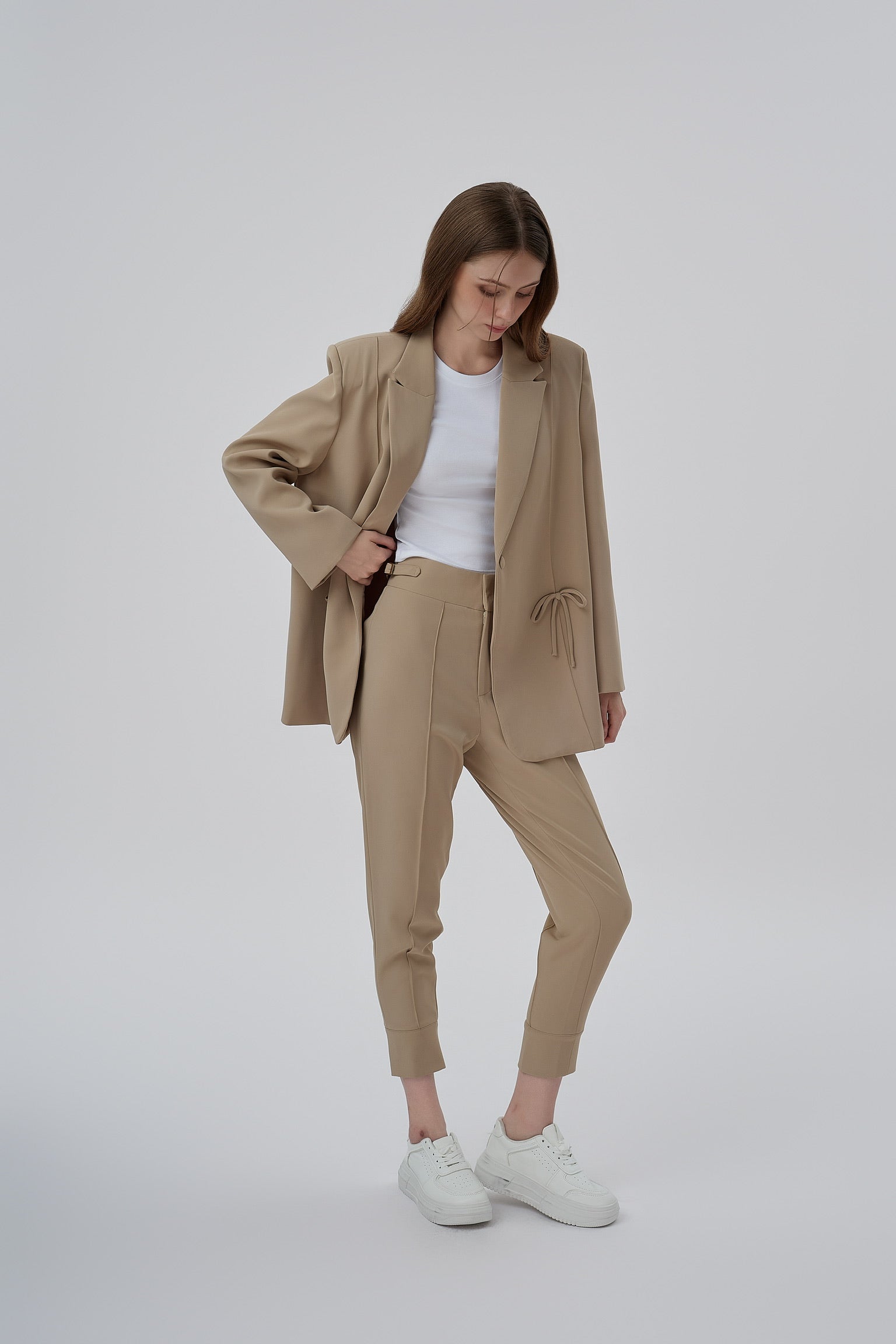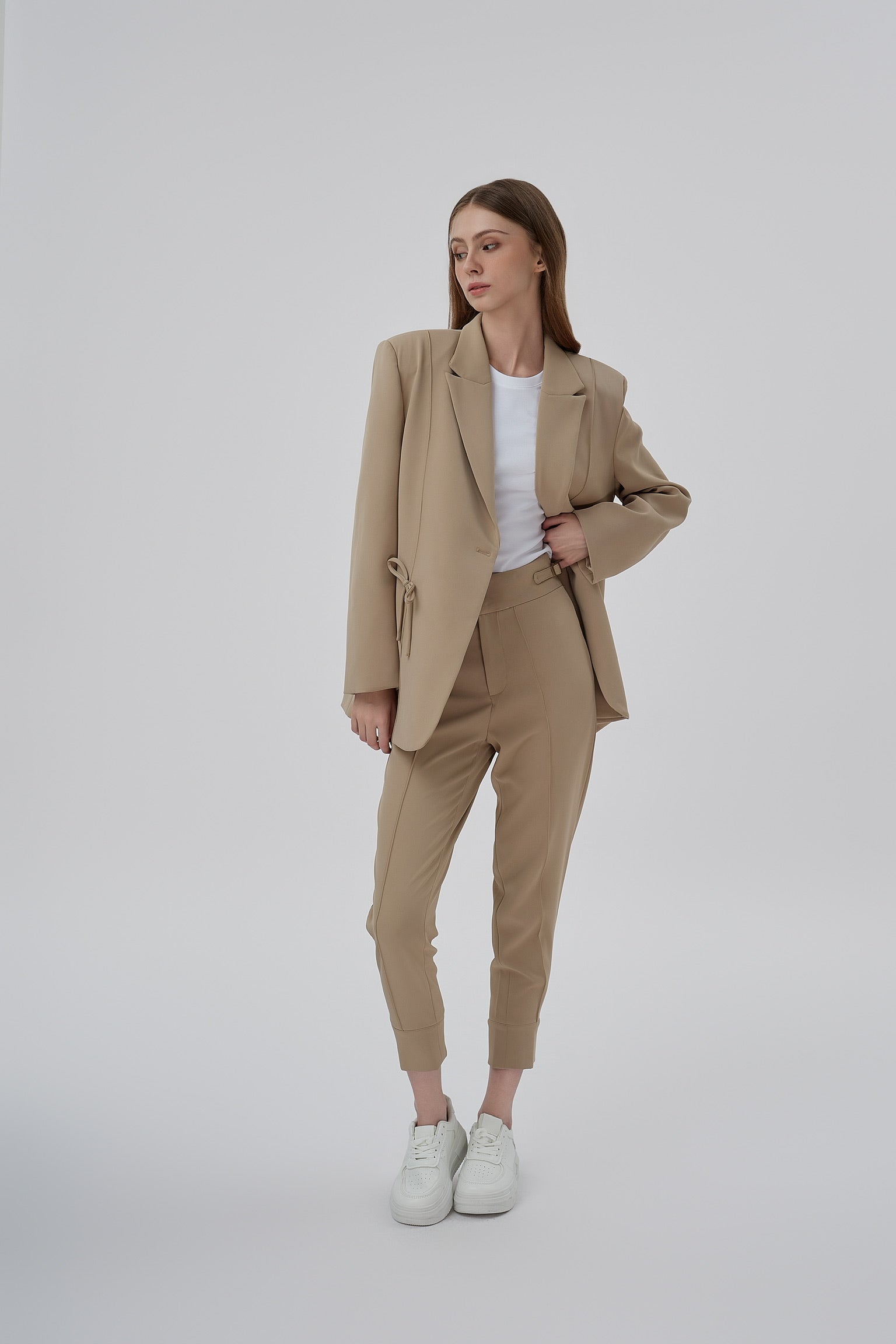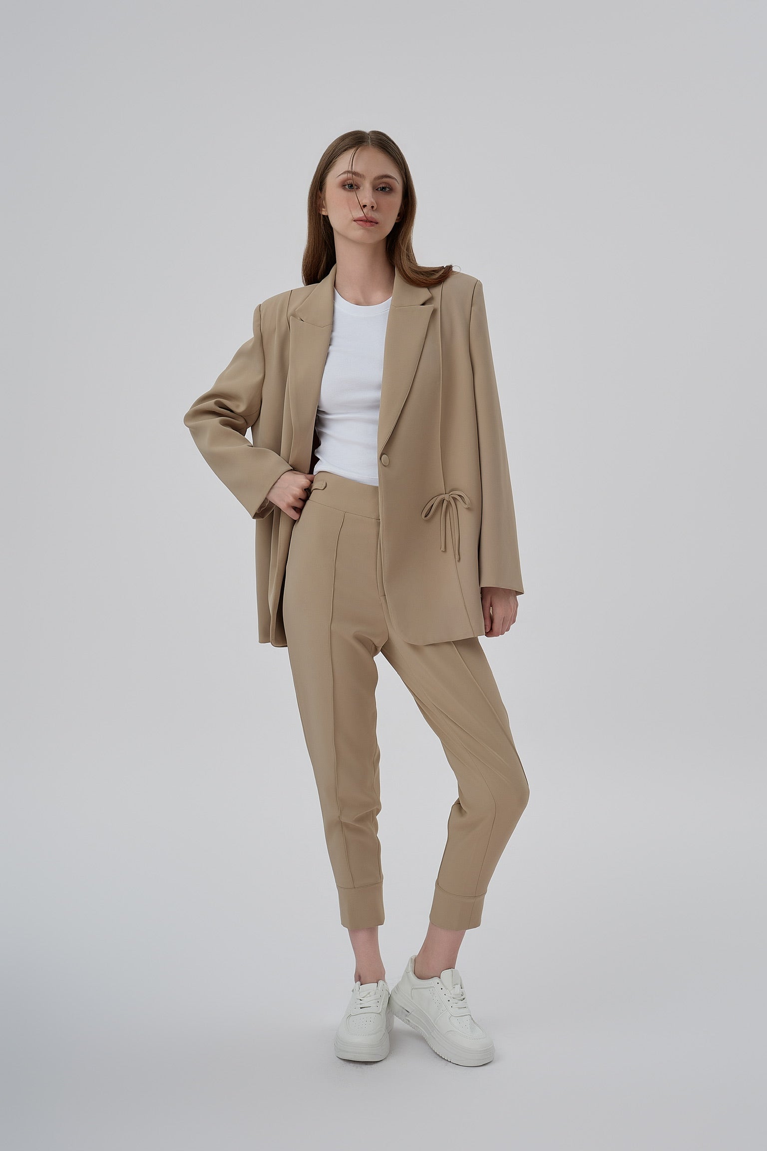 Cut to complement the Sheryl Blazer, these tailored pants bring balance and polish to the oversized silhouette above. Featuring a tapered leg, clean waistband, and minimal detailing, the design elongates the legs while offering ease through the hips and thighs.